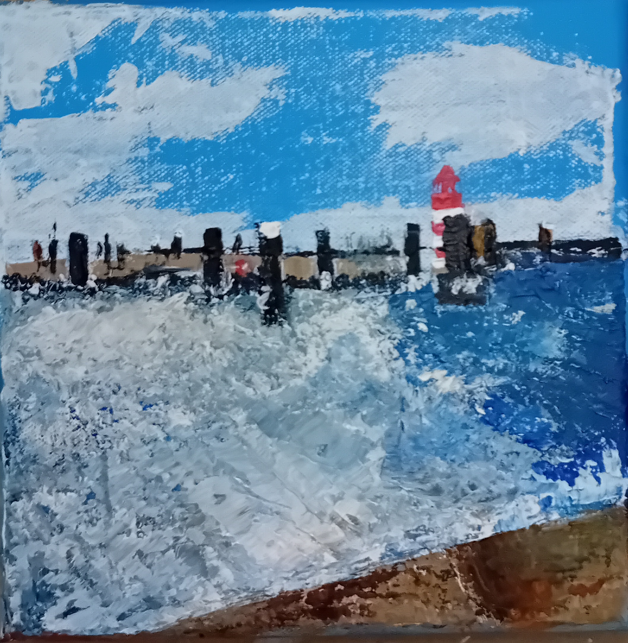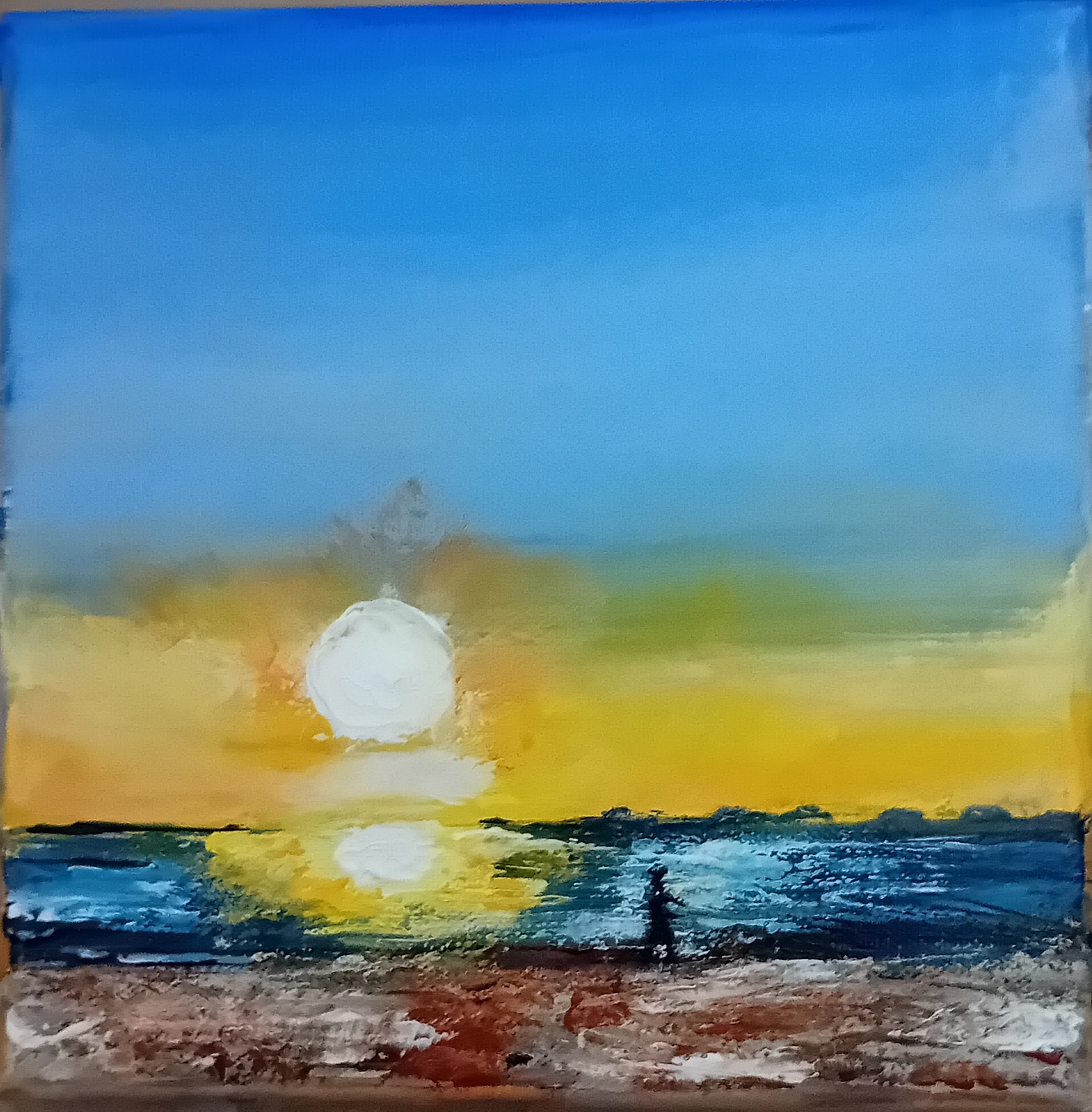 Auf eine 20x20 cm große Leinwand spachtele oder male ich mit Acrylfarbe ein aktuelles Februar Föhr Bild.